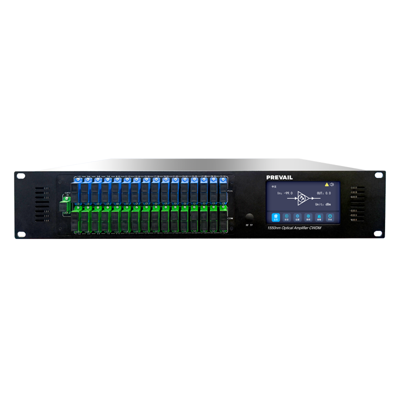 WE-1550-YZB-C型光纤放大器,2RU高度,4.3英寸TFT液晶宽屏显示,触摸屏按键,画面层次分明,菜单分列清晰。整机最大输出总功率可达+39dBm,最多支持64路输出,带CWDM, 可选配光开关或带RF检测。